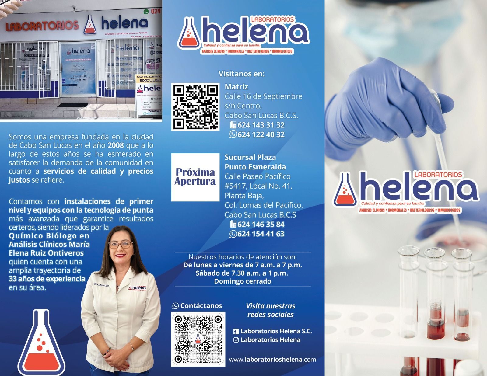 En Laboratorios Helena, situados en Cabo San Lucas, nos enorgullece ser su centro de confianza para análisis clínicos y mucho más desde 2008. Bajo la experta dirección de la Químico Biólogo María Elena Ruiz Ontiveros, quien cuenta con más de 33 años de experiencia en análisis clínicos, hemos establecido un estándar de excelencia, ofreciendo servicios de alta calidad a precios justos. Nuestras modernas instalaciones y equipos de vanguardia aseguran resultados precisos en cada prueba realizada.